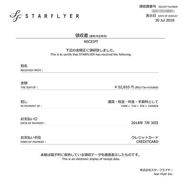 國際線:電子收據網路預覽服務(國際線) 這是一項於星悅航空官方網站・STARFLYER Taipei Service Desk(星悅航空台北客戶服務中心)所購買的機票,可在電腦板網頁顯示收據資料的服務。 ※ 電子收據網路服務為電子文書資料。印刷的單據是否可使用於會計報帳,需請旅客自行事先確認。 在電子收據網路服務顯示 放大畫面查看 ※ 如以下的情況,則無法電子收據網路服務 透過旅行社、星悅航空以外的窗口購票時 使用哩程兌換的機票等票價金額為0時 電子收據網路服務的使用方法 收據開立時間點可分為以下二種 購票時開立 購票後開立