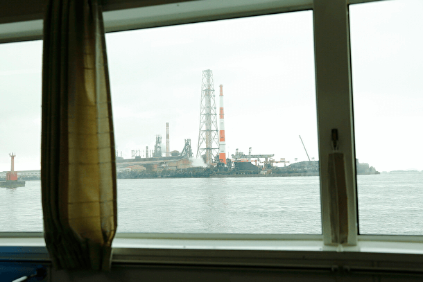 出發後、從船上向外眺望。渡輪沿著對岸的工業地區前進。