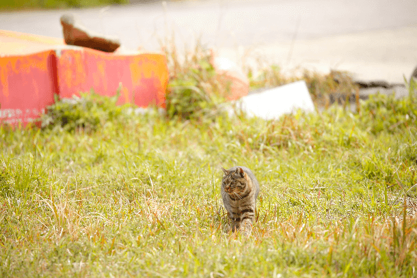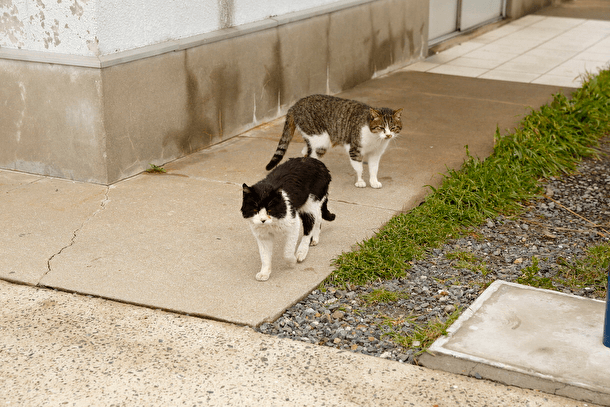 如同傳言、此處確實居住著許多貓咪、路旁鑽出一隻、民宅屋簷下藏有一隻、小型貨車的車台上也有、諸如此類、貓咪們自然而然地聚集來到此處。