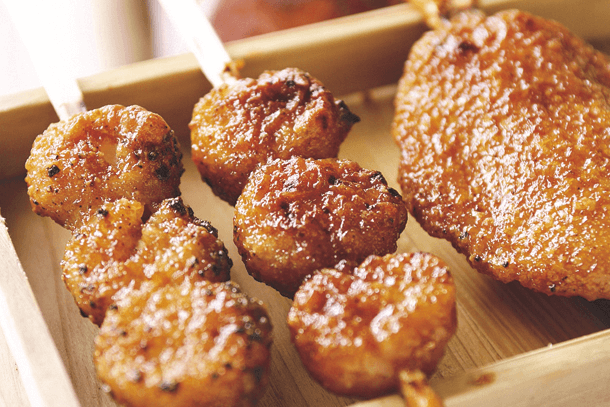 說到邊走邊吃的美食就不能錯過五平餅。它是先沾上加入碾碎的芝麻、胡桃、花生的自家製醬油後再燒烤。