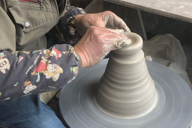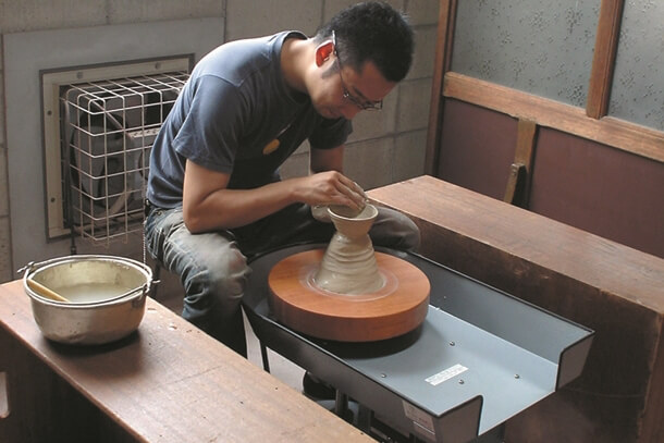 創業60年的窯元,如同往昔以薪石窯燒窯方式,在接受訂單後全部以手工作業方式製作。自家的藝廊咖啡展示了許多個年代的作品。