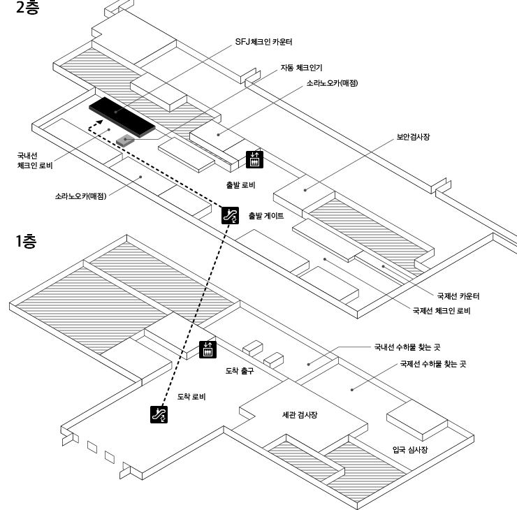 탑승수속은 2층 SFJ 체크인 카운터 에서 진행됩니다. |