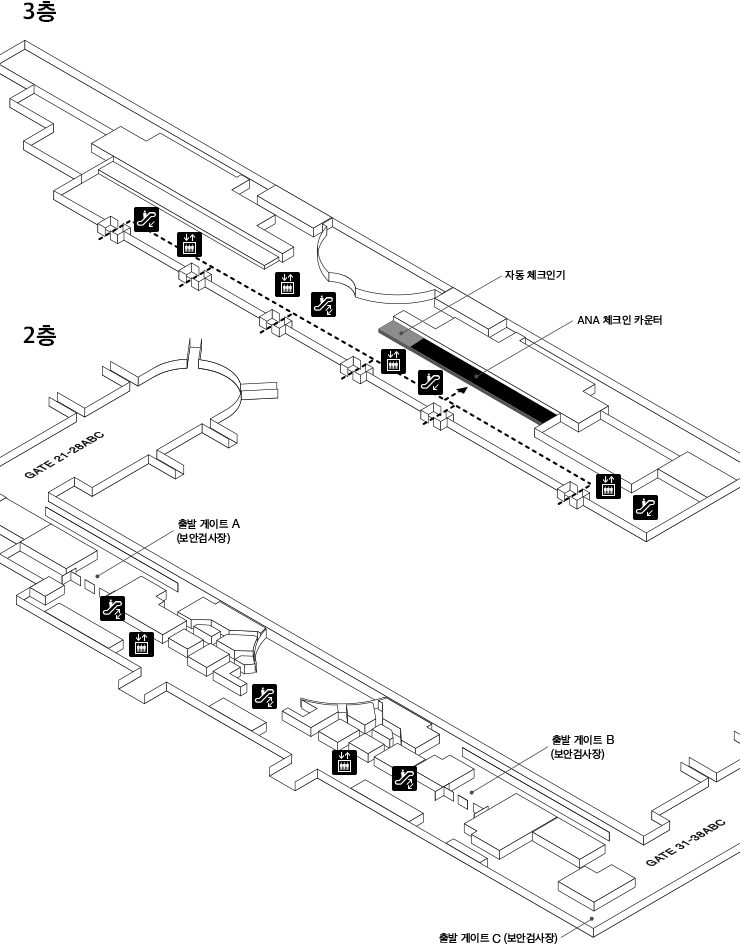 보안검사장은 '출발 보안검사장 A'만 이용하실 수 있습니다.그 밖의 검사장은 이용하실 수 없으므로 주의하십시오.