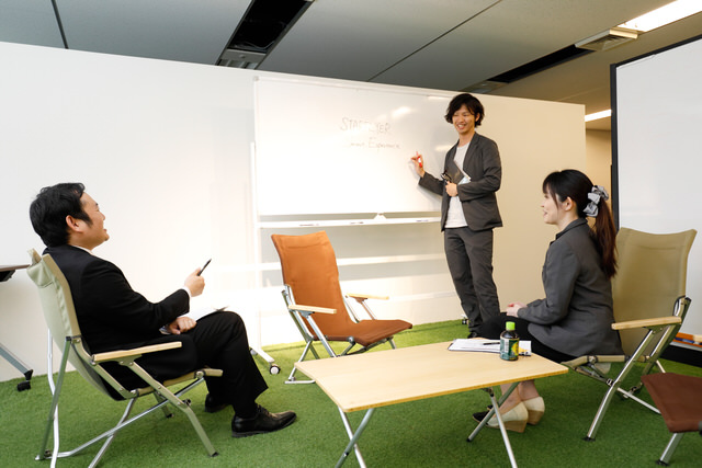 きれいな人工芝が敷かれたイベントスペースは、トークイベントやプレゼンテーションはもちろん、少人数のミーティングでも利用可能。