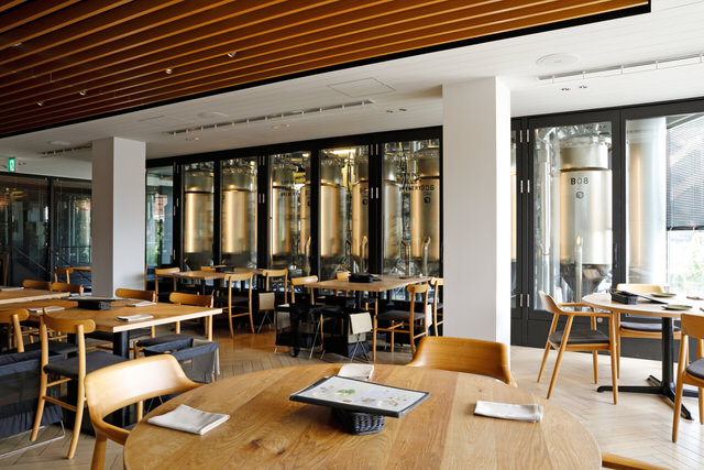 広々とした店内は、木の温もりが心地よい空間。店内の醸造設備では、年間40種類以上のオリジナルクラフトビールが生成され、季節に合った限定ビールがお目見えします。