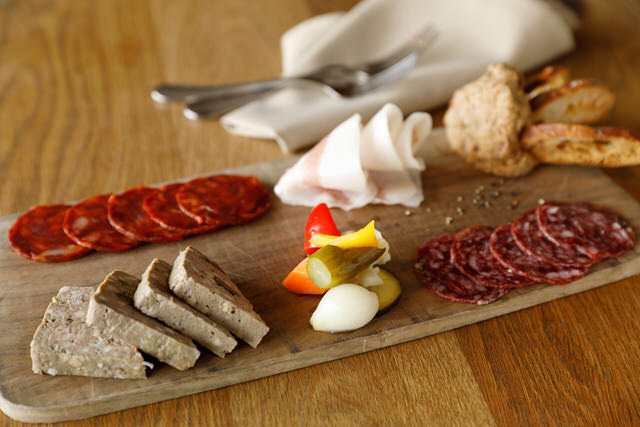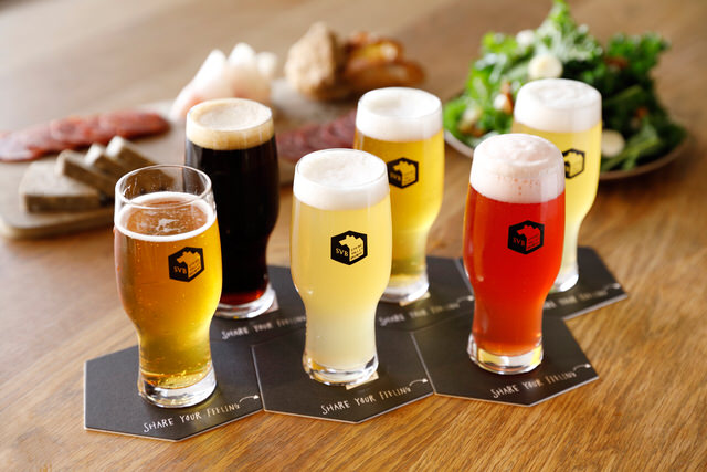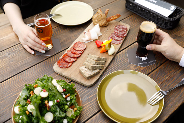 シェフが厳選したこだわりのハムやサラミが並ぶ「SVB特製 シャルキュトリ盛り合わせ5種盛り(1,800円~)」は、クラフトビールとの相性抜群!