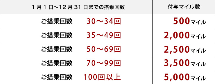 毎年1月1日から12月31日までの1年間にご搭乗いただいた累計回数に応じて、翌年4月にボーナスマイルをプレゼントいたします。