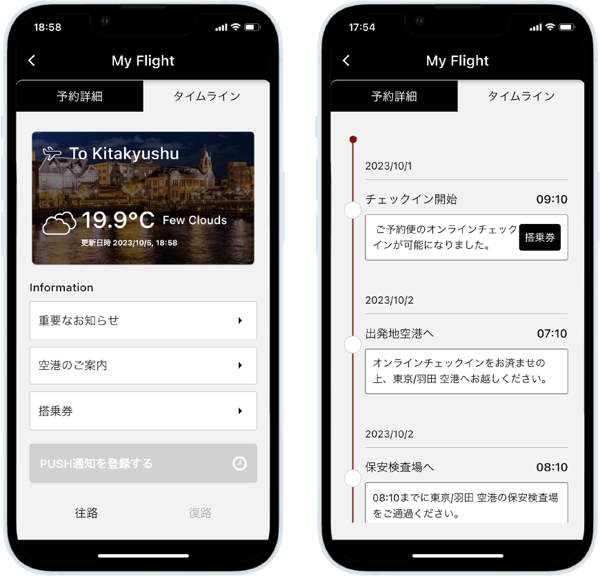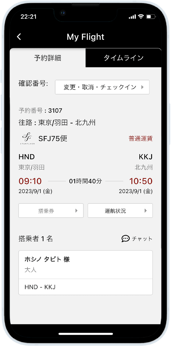 - 予約詳細やタイムライン画面で搭乗に必要な情報を確認。