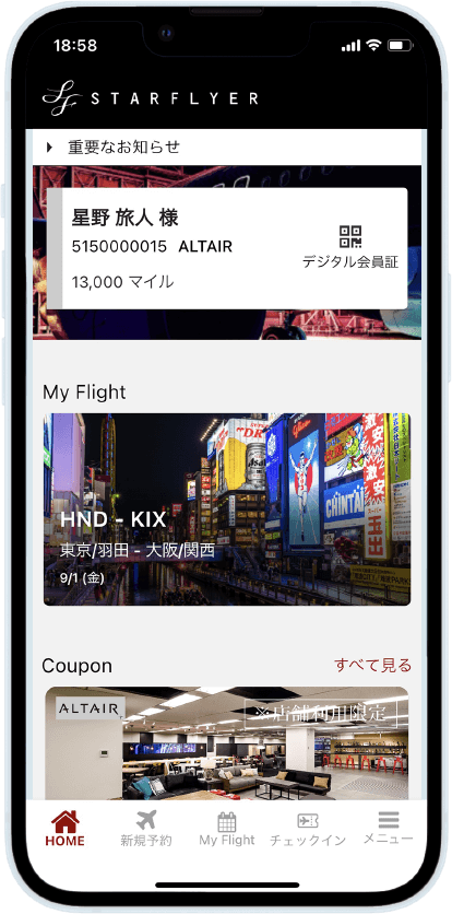 新しいアプリをダウンロード後、会員ログインしていただくだけでMy Flightに予約情報が表示されます。