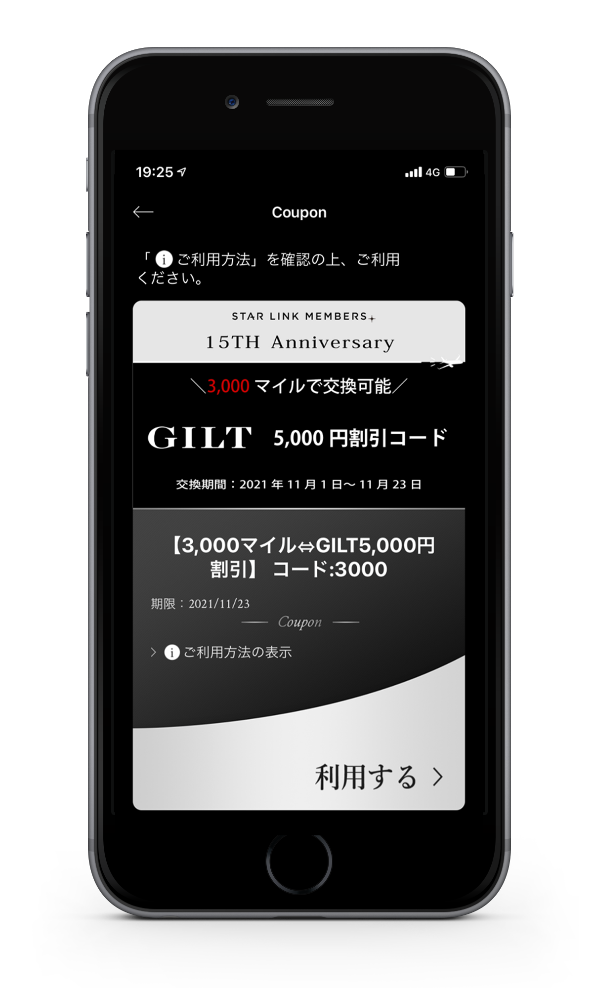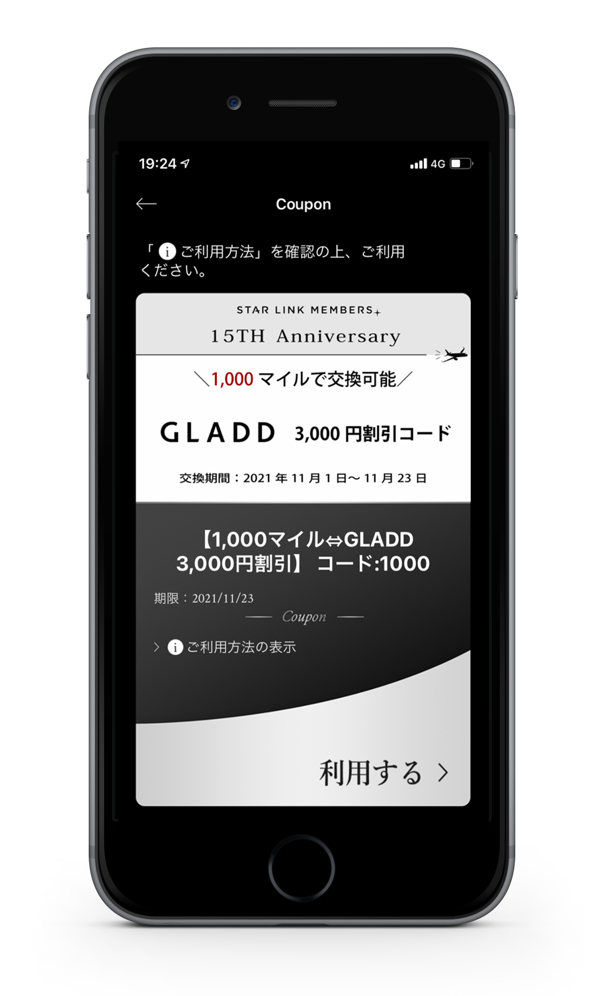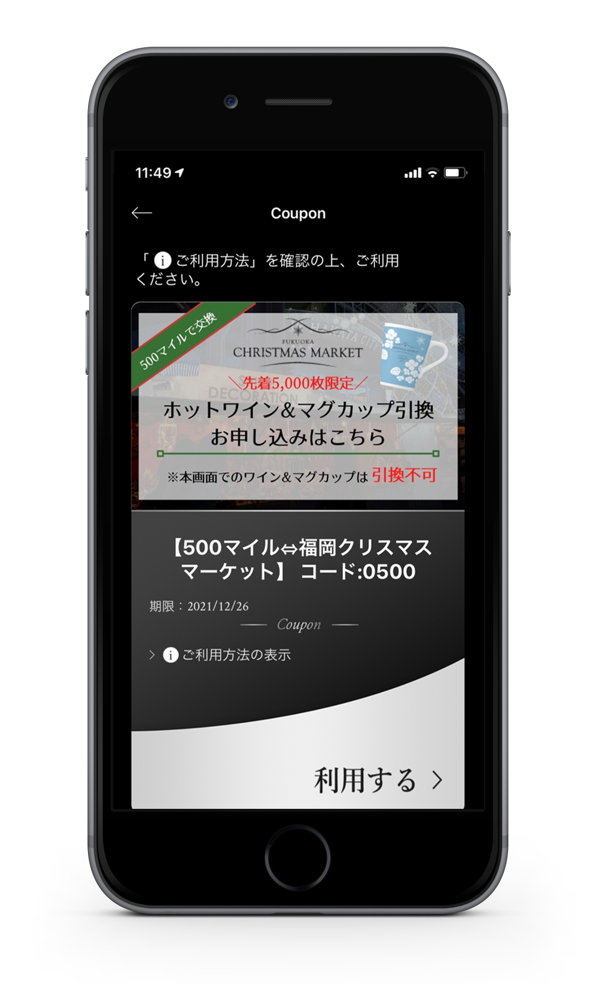 クーポン画面内の有効期限に関わらず、保有マイルが必要なマイル数に満たない場合は、クーポンが無効となります。