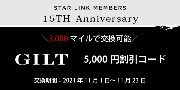 対象期間中にスターフライヤー公式アプリから本クーポンをご利用いただくと、お持ちの3,000マイルを、フラッシュセールサイト「GILT」で使える「5,000円割引クーポン」に交換いただけます。