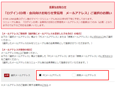 PCメールアドレス欄にご登録のメールアドレスを移行いたしますので、会員ログインの際は、PCメールアドレスまたはSTAR LINK会員番号(10桁)とパスワードをご入力ください。