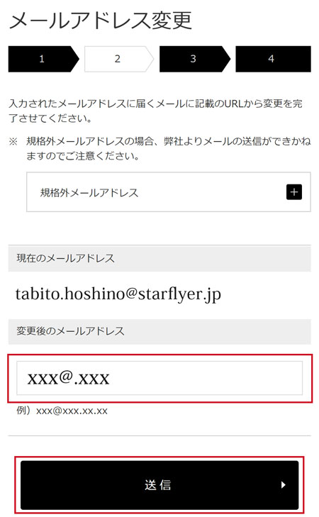 リニューアル以降は会員情報欄にスターフライヤーが設定した移行用メールアドレスが登録されるため、メールアドレスでログインすることが出来ません。