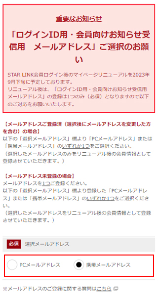 STAR LINK会員向け「ログインID用・会員向けお知らせ受信用 メールアドレス」のご登録ならびに更新のお願い