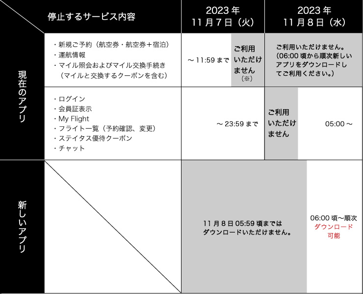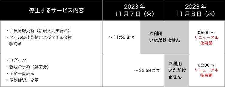 2023年11月8日(水)のスターフライヤー公式アプリ・マイページのリニューアルに伴い、2023年11月7日(火)から11月8日(水)までの間、サービスを停止する時間帯がございます。詳しくは以下の停止するサービスよりご確認ください。