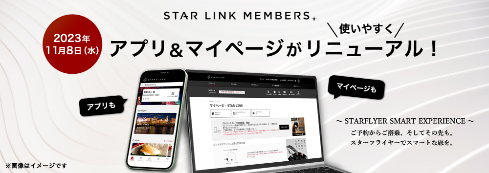 2023年11月8日(水)にスターフライヤー公式アプリおよびマイページ(STAR LINK会員向け専用ページ)のリニューアルを予定しております。