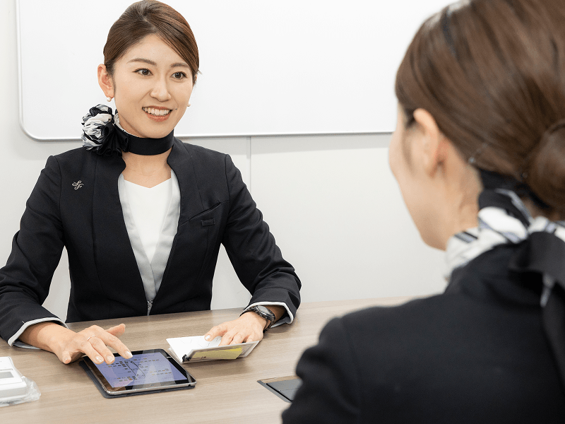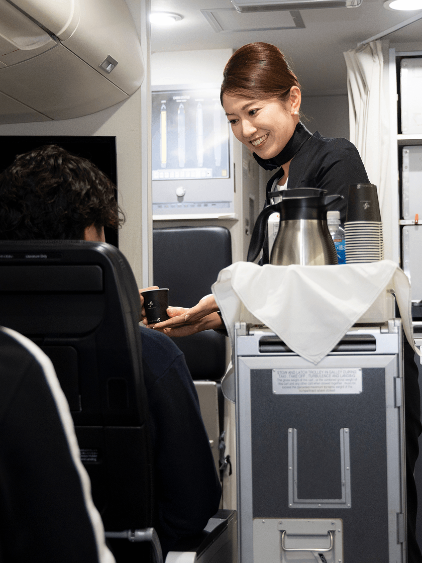 機内では、過不足のないおもてなしを提供するため、お客様一人ひとりの想いに寄り添ったサービスを心がけています。 -