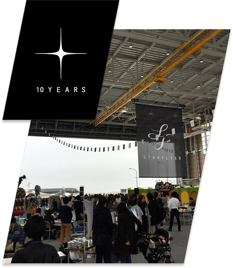 2016年3月、スターフライヤーは就航10周年を迎えました。節目の年には、制服リニューアルや羽田・北九州のチェックインカウンター刷新など、サービス品質向上とブランドの浸透に向けた取り組みが行われました。あわせて、記念式典や格納庫を開放した感謝祭をはじめ、ジャズナイトやハロウィンイベントなど、社員主体で企画・開催。お客様や地域とのつながりを大切にしながら、次の10年へと歩みを進める節目の一年となりました。