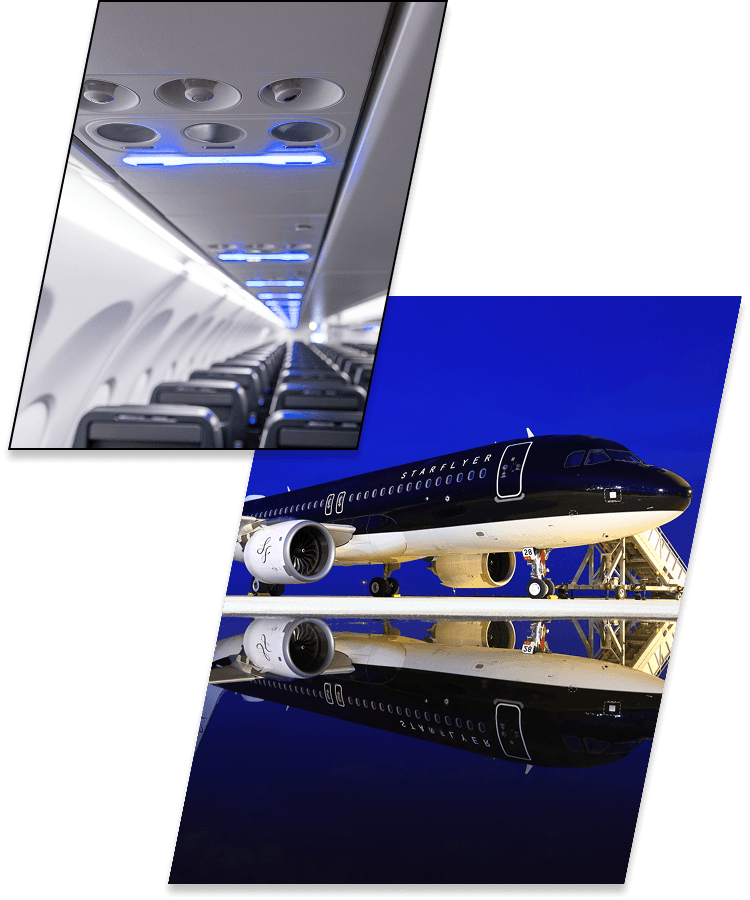 A320型機を長年運航してきたスターフライヤーでは、従来型A320の生産終了を機に、性能と快適性を進化させたA320neoを新たに導入しました。新型エンジンにより燃料消費やCO₂排出量、騒音を大きく抑え、環境にも配慮しています。さらに日本で初めて最新機内空間「AIRSPACE」を採用し、広い手荷物収納や照明演出で、より心地よい空の時間を提供しています。