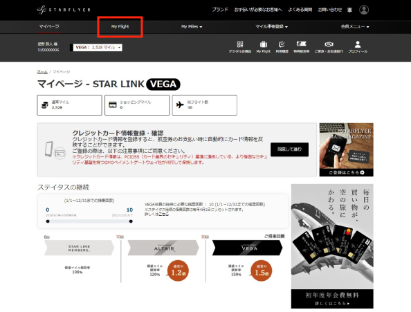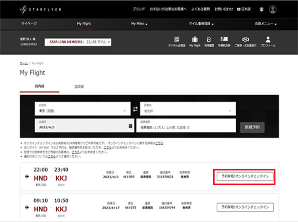 ログイン後、「My Flight」を選択してください。予約の一覧が表示されます。