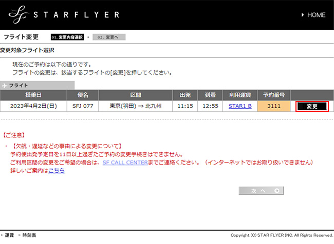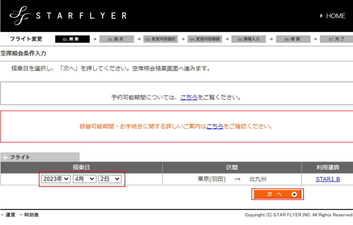 変更したい便の「変更」ボタンを押下し、搭乗希望日を入力後「次へ」の空席照会を行います。