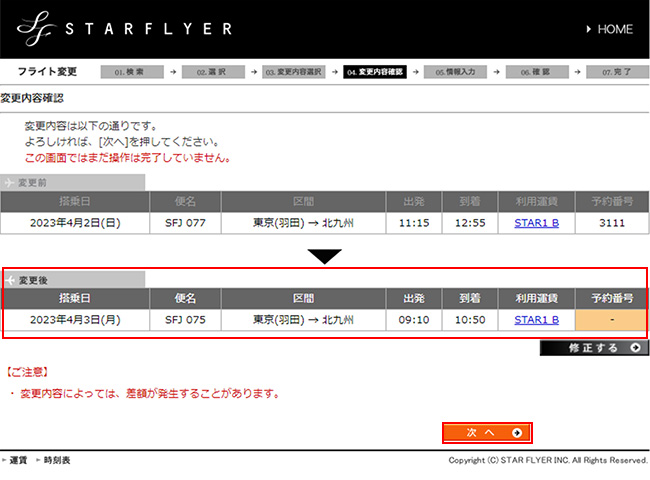 搭乗希望便を選択し、振替便予約取得後、「次へ」を押下します。