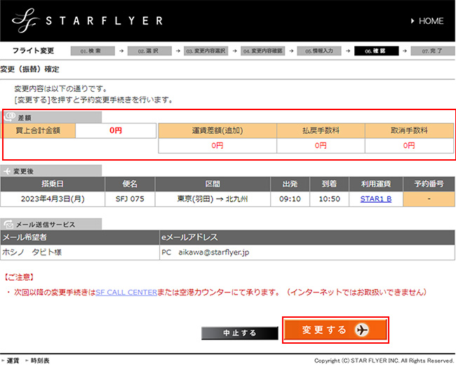 変更確定画面にて差額がないことを確認し、「変更する」を押下し、変更完了画面下の「終了する」ボタンにてお手続きを終了してください。