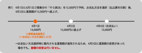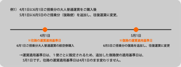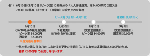 「航空券の購入日において、お客様がご搭乗される日に有効な運賃・料金」が適用されます。航空券ご購入後にご利用便の運賃額に変更があった場合でも、差額の収受または払戻しは行いません。