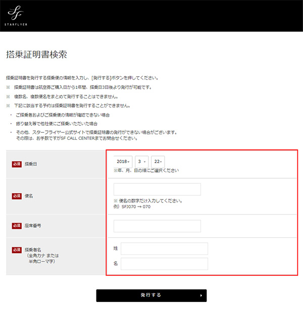 照会の際は発行する搭乗便の情報を入力し、[発行する]ボタンを押してください。