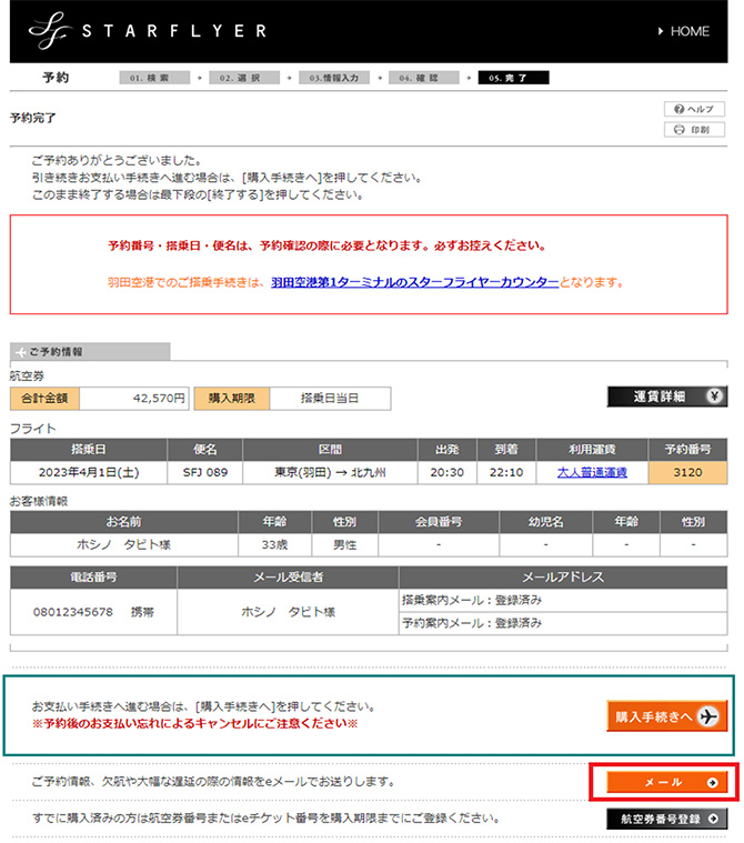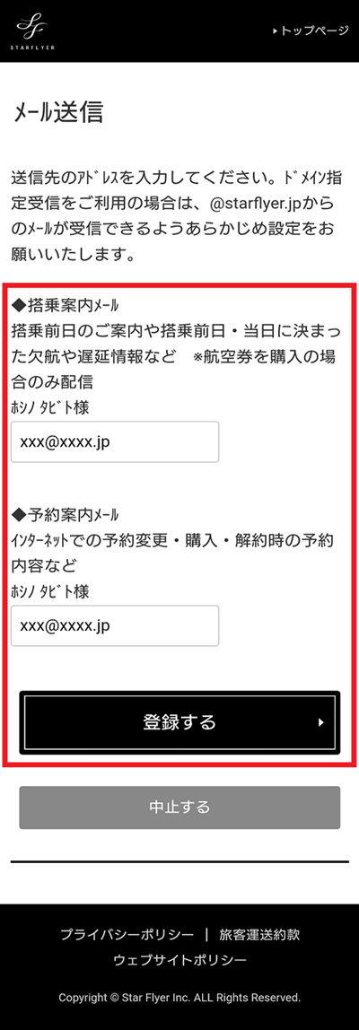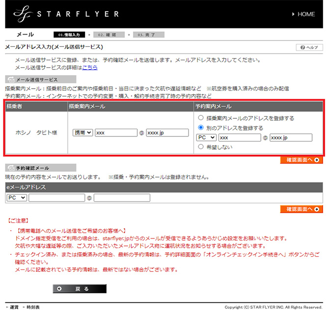 こちらのみ登録いただいた場合は、搭乗案内メール・予約案内メールは届きませんのでご注意ください。
