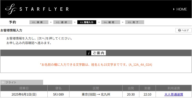 スターフライヤー公式予約サイトで航空券を予約する際に、名前の姓と名の入力可能な文字数には制限があります。