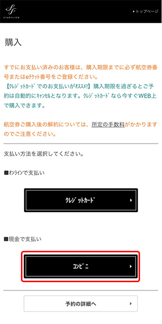 ホームページの予約完了画面、または予約確認画面より購入手続に進みます。コンビニ支払画面でセブンイレブンの[オンライン決済番号印刷]を選択してください。払込票番号(お支払い方法のご案内)を表示し、画面を印刷して、セブンイレブンのレジにて払込票をお渡しいただき、現金でお支払いください。