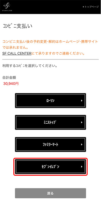 『コンビニ選択』画面のセブンイレブンの項目にある[オンライン決済番号印刷]を選択します。