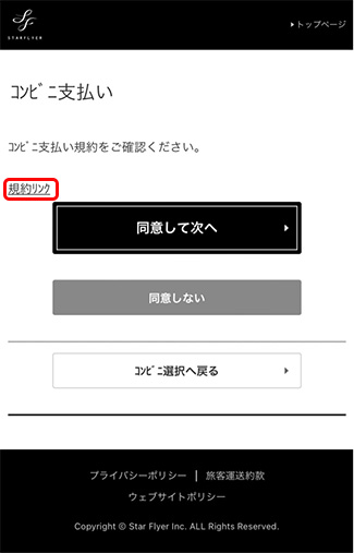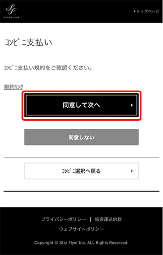 (規約確認済みの場合):同意して次へをタップ(同意しないとコンビニ支払いは利用不可)