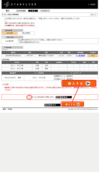 『支払い内容確認』画面では、コンビニ支払規約のチェックボックスへチェックを入れ[購入する]を選択します。
