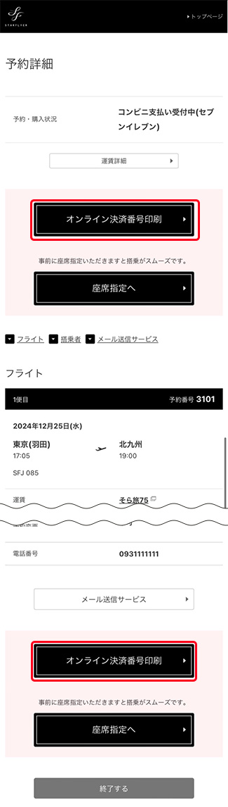 『予約確認』画面で[オンライン決済番号印刷]を選択します。