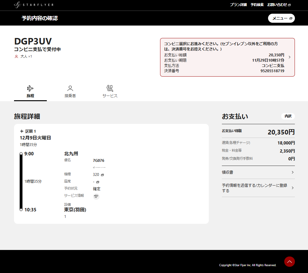 お支払い後、スターフライヤー公式サイトにて予約検索を行い、「eチケットお客様控え」をご用意ください。