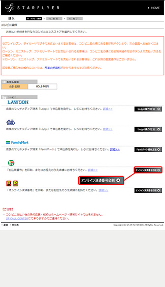 ホームページの予約完了画面、または予約確認画面より購入手続に進みます。コンビニ支払画面でセブンイレブンの[オンライン決済番号印刷]を選択してください。払込票番号(お支払い方法のご案内)を表示し、画面を印刷して、セブンイレブンのレジにて払込票をお渡しいただき、現金でお支払いください。