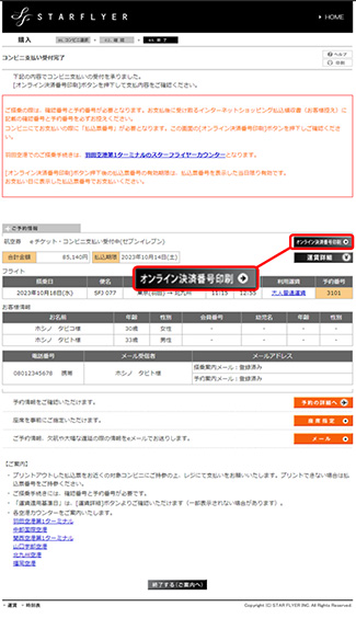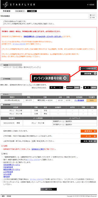 『予約確認』画面で[オンライン決済番号印刷]を選択します。