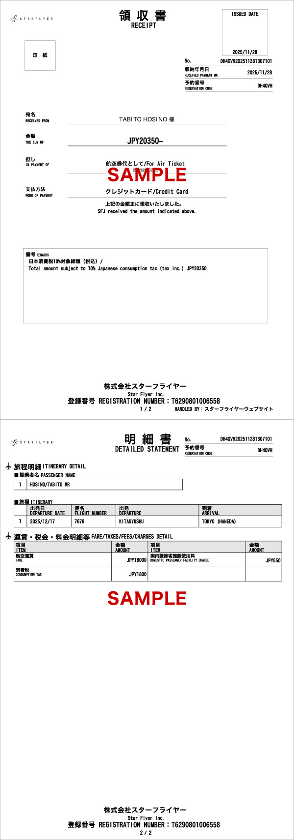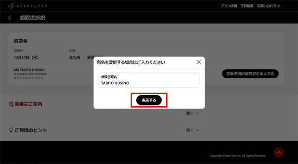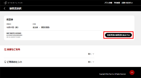 領収書選択画面にて「搭乗者別の領収書を表示する」を押してください。