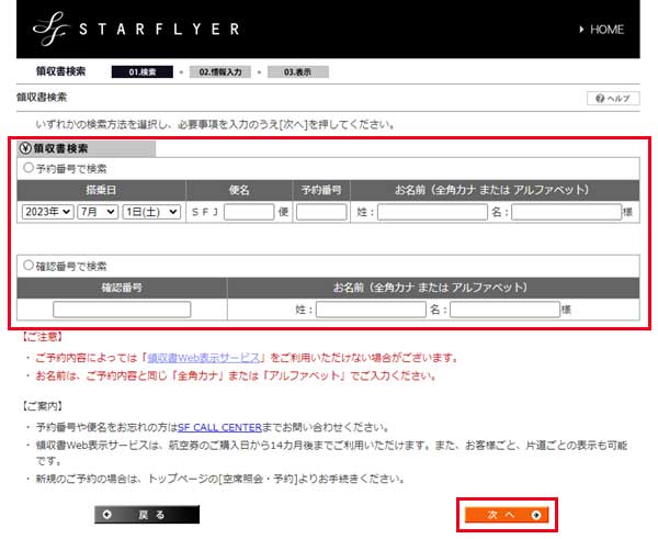 領収書検索画面にて、領収書を発行したい記録を照会してください。照会の際は、いずれかを選んだ上で必要項目に入力を行い、「次へ」ボタンを押してください。