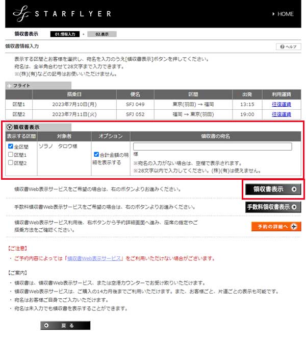 領収書情報入力画面が表示されますので、以下を入力・選択の上、「領収書表示」ボタンを押してください。