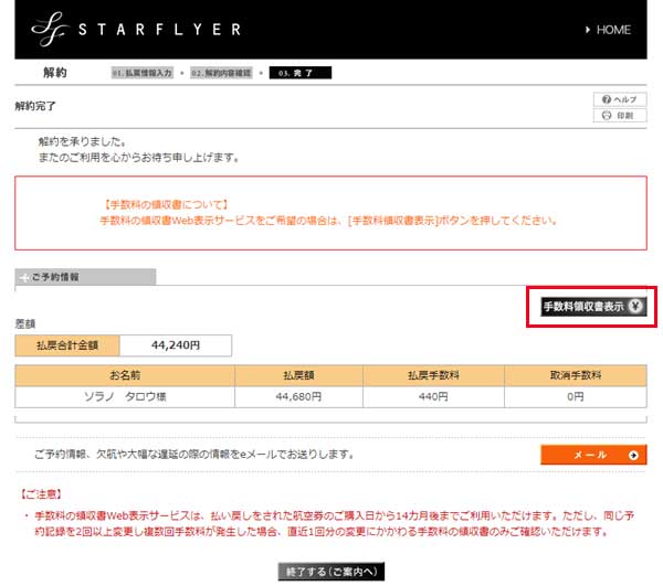 解約を完了後、解約完了画面の上部に「手数料領収書表示」ボタンが表示されますので、こちらを押してください。