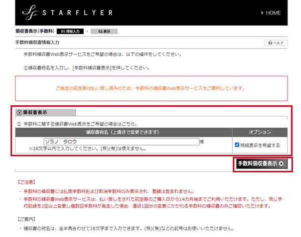 手数料領収書情報入力画面の表示後、以下を入力・選択の上、「手数料領収書表示」ボタンを押してください。