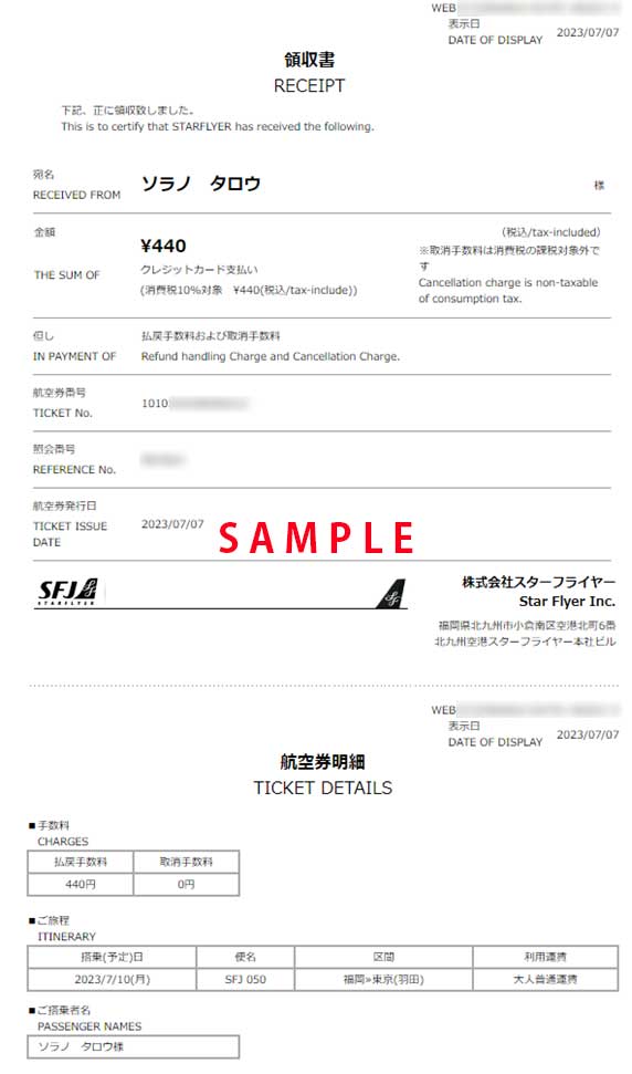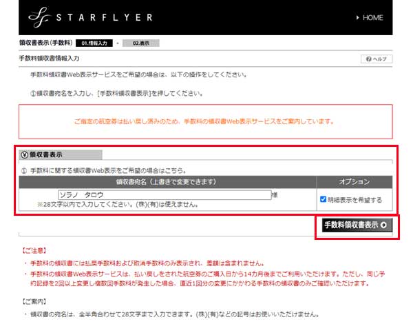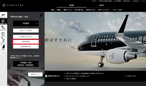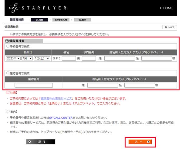 SFJホームページの「予約確認・変更」クリック後、赤枠内「領収書の検索」を押してください。