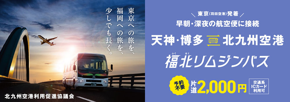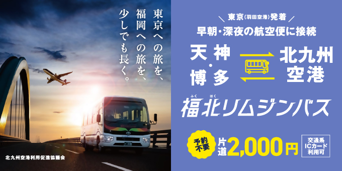 北九州空港発着の早朝深夜便にあわせて、北九州空港⇔博多・天神間を結ぶ福北リムジンバスが運行中です。