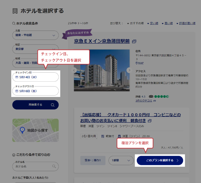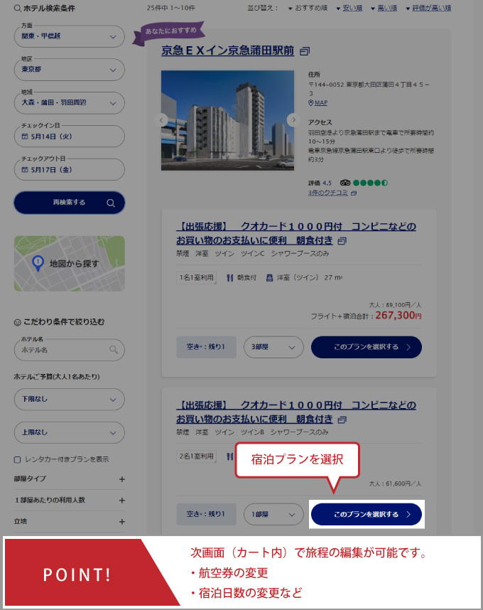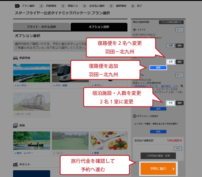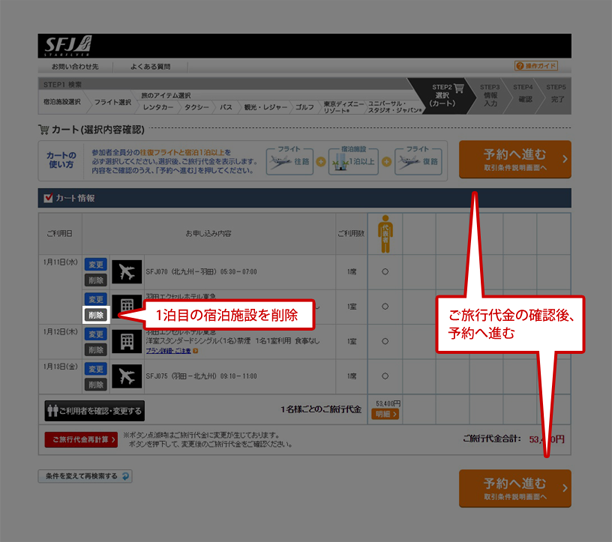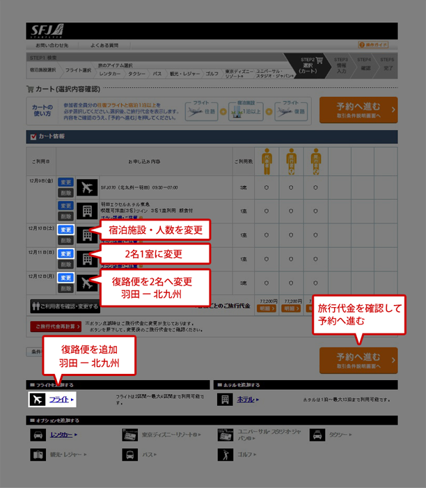 カート(選択内容確認画面)で登録内容とご旅行代金の確認