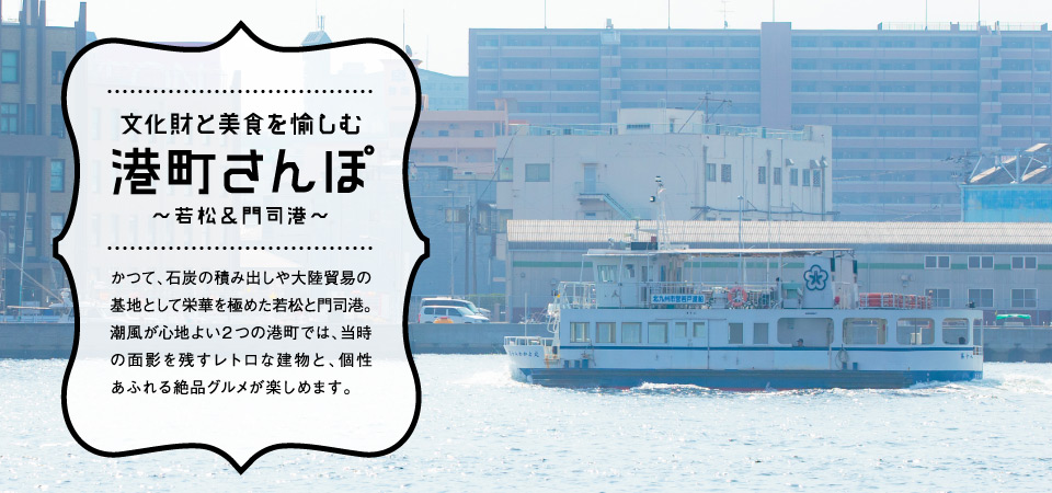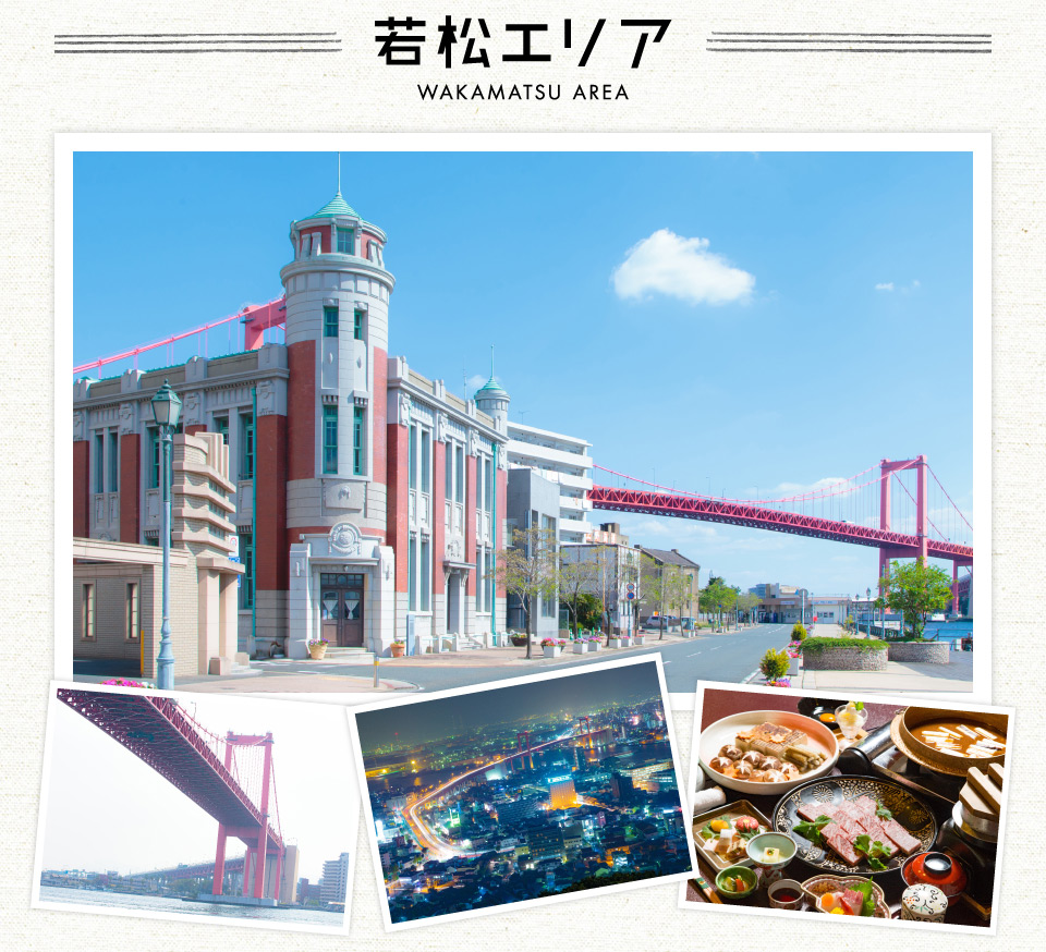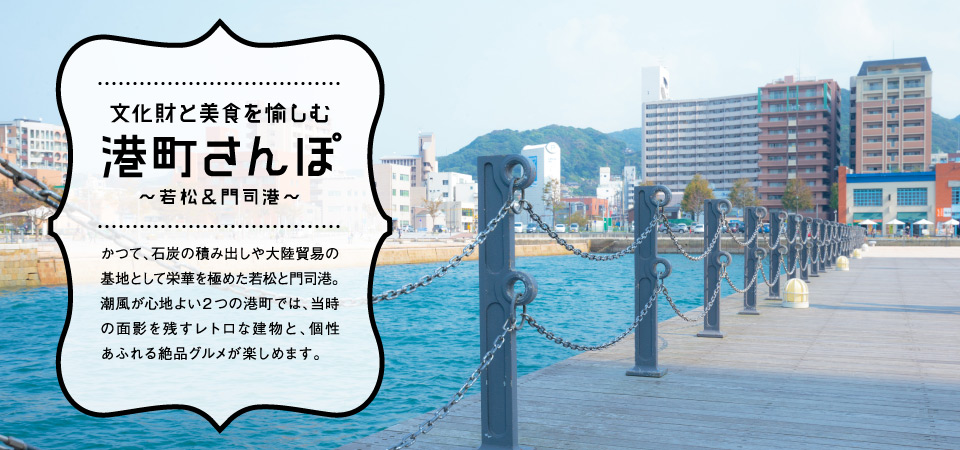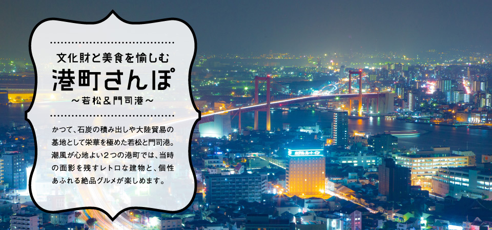 空と海のブルーに赤が映える若戸大橋のたもとは「南海岸通り」と呼ばれています。大正ロマンを感じさせる産業遺産や文豪が愛した美食、夜は夜景まで楽しめる、絶好のお散歩エリアです。