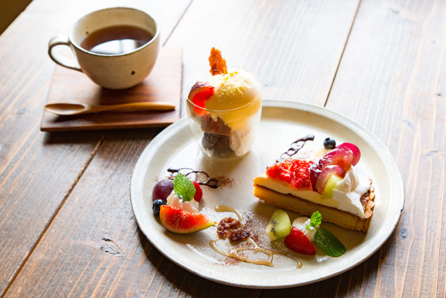 作り手が分かる地元の農家などを中心に、安心で安全な食材を提供するカフェ。種類豊富なランチや、絵本に出てくるようなスイーツ、心とカラダに優しいドリンクなどが、訪れる人々を癒します。写真は2種類のケーキやタルトなどにドリンクが付く「ケーキプレート」。刻々と表情を変える関門海峡、船の往来や汽笛の音を聞きながら、港町での時間をゆったり過ごせる場所です。