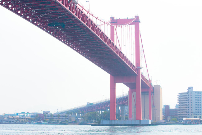 洞海湾をまたぎ、若松区と戸畑区を結ぶ、両区のシンボルとも言える橋です。昭和37(1962)年、国内初の長大吊り橋として開通した当時は、東洋一の長さ(全長2.1km)を誇りました。目にも鮮やかな赤色には、エネルギー・情熱・使命を象徴する色としての想いが込められているそうです。夜になるとライトアップされ、昼とは違う雰囲気に。毎年7月には橋の周辺で花火大会も行われています。